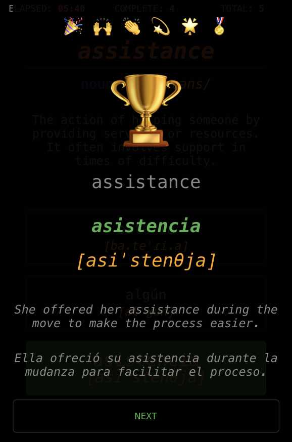 Pick up right where you left off—your words and practice sets stay the same all day. See pronunciations, words in context, and build memory through steady repetition.